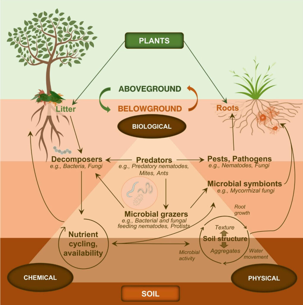 Interactions between aboveground and belowground processes in an ecosystem.